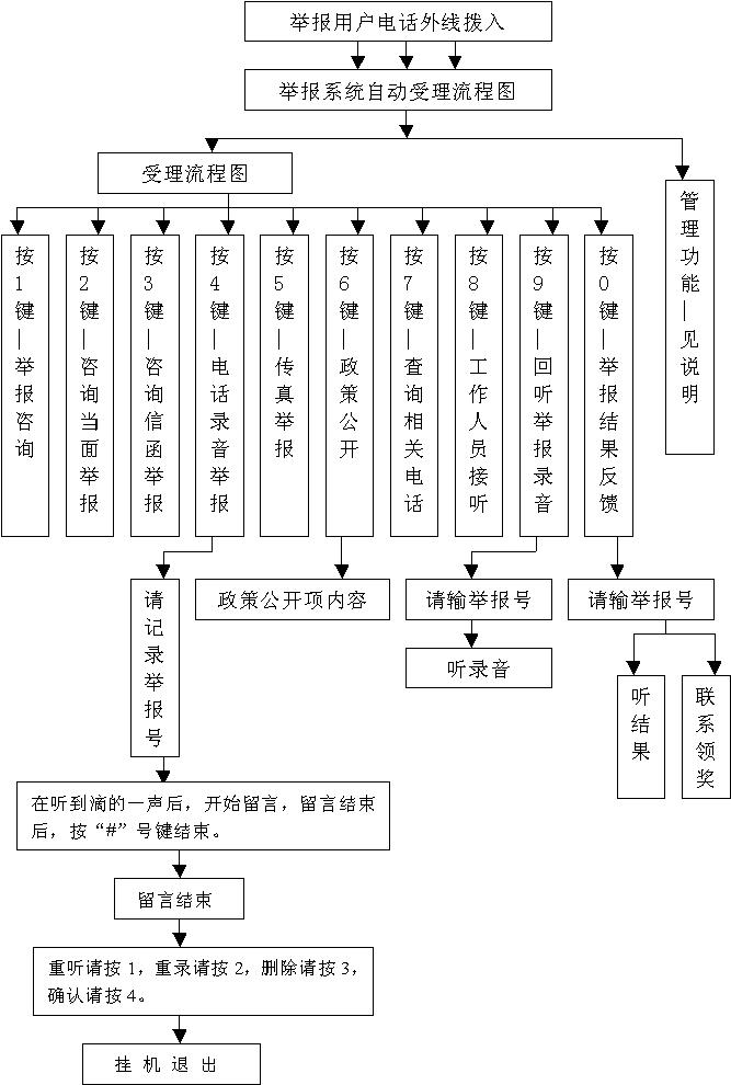 8、举报反馈——工作人员按照举报人输入的举报号,将举报案件的处理结果用声音录入该系统,供举报人查询。举报人按下“0”键,输入自己的举报号,即可到受理部门对自己举报结果的答复。